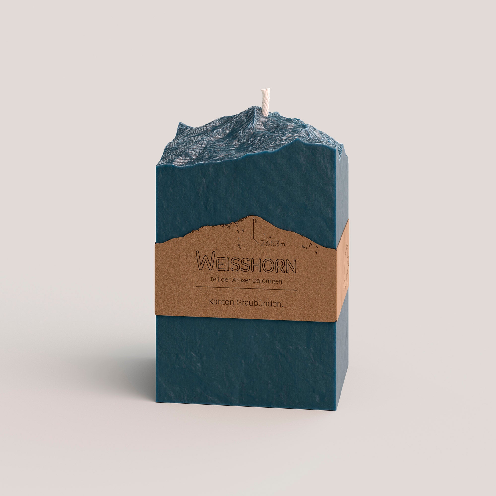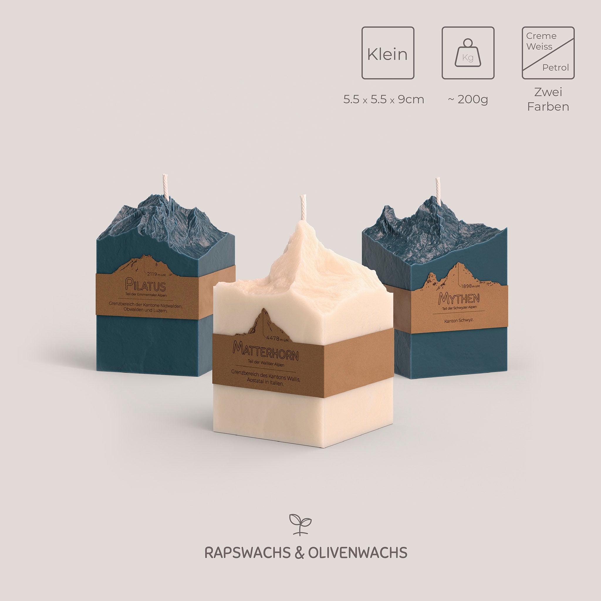 Mit einer 3D Relief - Berg Gipfel Kerze holst du dir ein Stück der Schweizer Alpen in dein Wohnzimmer. Das weltberühmte Matterhorn, die imposante Eiger Nordwand, der prominente Pilatus und das Schwyzer Wahrzeichen schlechthin - der Grosse Mythen. Die Kerzen sind jeweils in zwei Farben erhältlich, Creme Weiss und Petrol (dunkles Blau-Grün). Sie bestehen zu 100% aus nachhaltigen, natürlich vorkommenden Rohstoffen aus europäischer Produktion (50:50 Raps- und Olivenwachs).